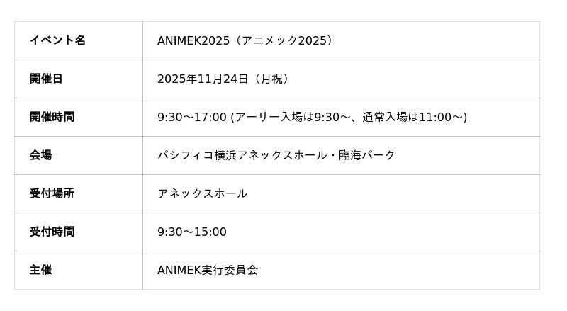 ANIMEKに関する最新情報や詳細な参加ルールについては、公式サイトおよび公式SNSをご確認ください。
