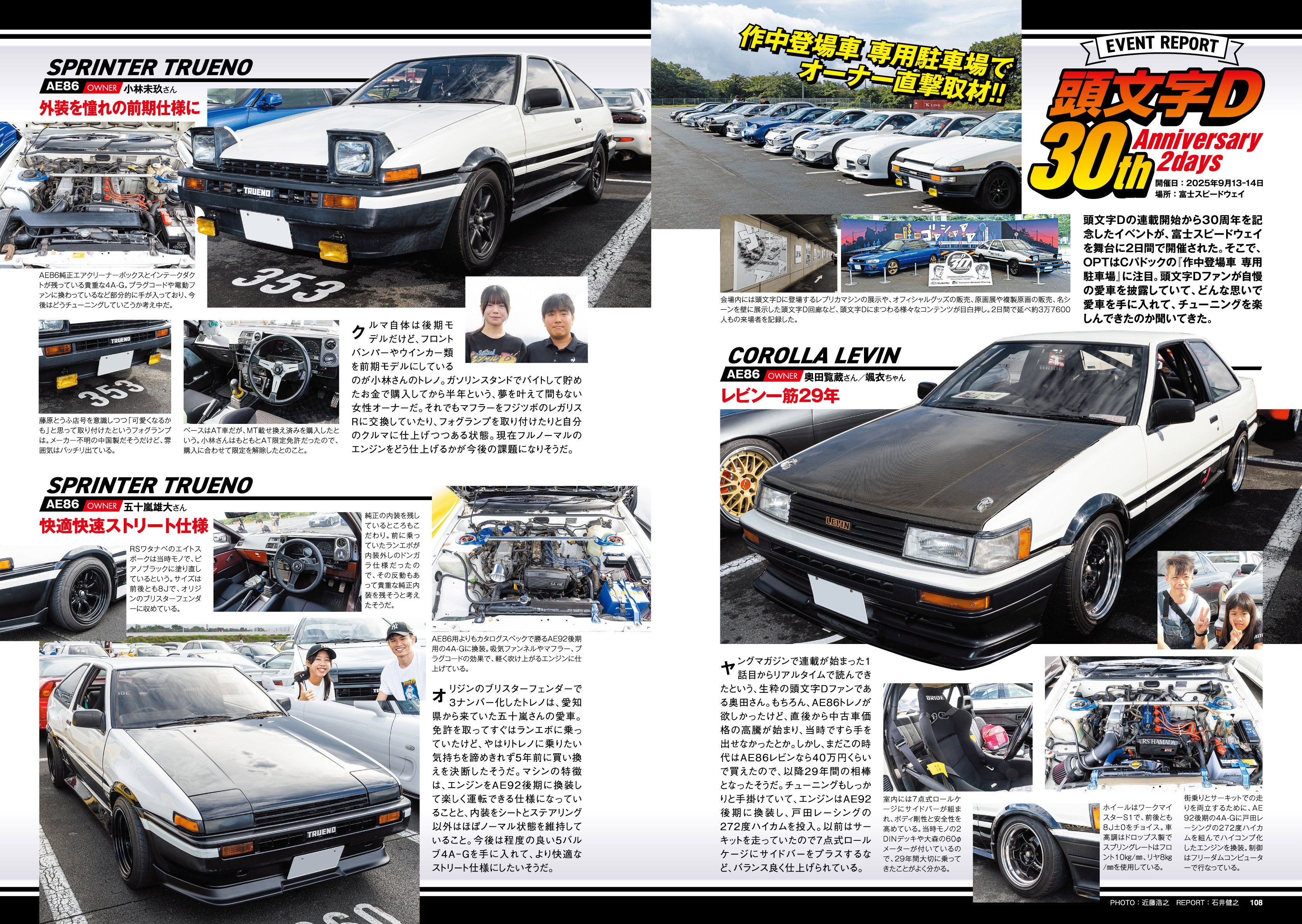 頭文字Dの連載開始30周年を記念して、富士スピードウェイにて2日間で開催されたイベントから、OPTはCパドックで行なわれた「作中登場車 専用駐車場」に注目。劇中レプリカから独自解釈のチューンドまで、面白マシン13台を紹介していこう。