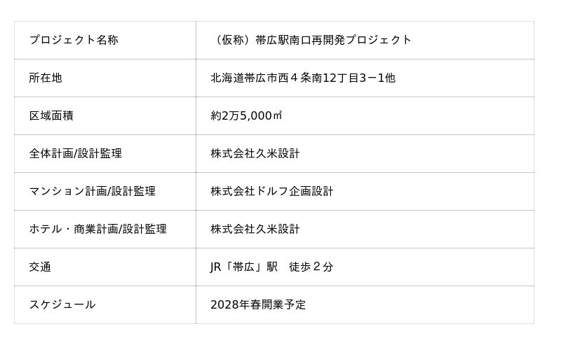 本プロジェクトは、株式会社登寿ホールディングス (本社:北海道帯広市、代表取締役社長 宮坂寿文)が事業主として推進し、JR帯広駅南口、旧長崎屋帯広店の跡地に誕生します。2万5,000平方メートル という広々とした敷地に、高層分譲マンションやホテル、商業施設などを含めた新施設が建設される予定です。本リリースでは、このプロジェクトの概要や背景、各施設を先行してご紹介します。