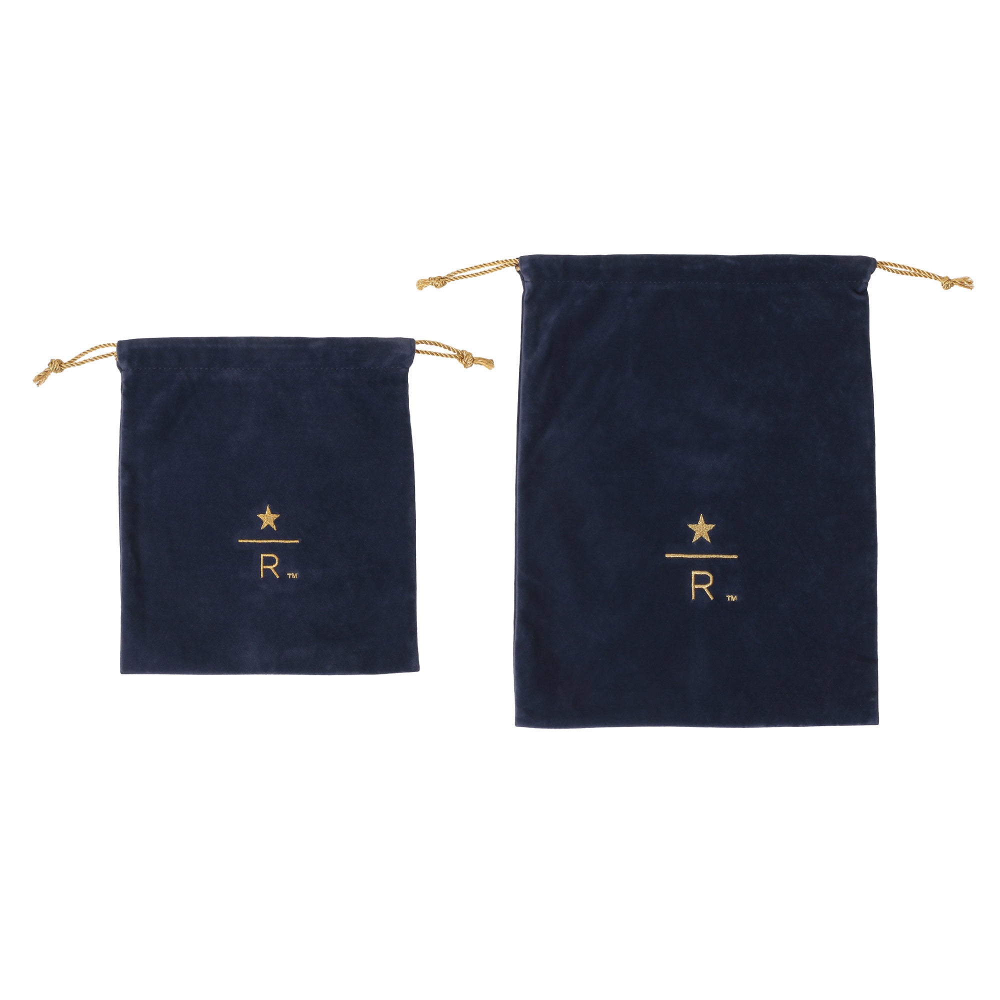 ネイビーのボディと、ゴールドのひもや刺繍で華やかな舞台幕をイメージした巾着型のポーチ。2サイズをご用意しました。小物をまとめるのにぴったりな普段使いしやすいSサイズ。また、マグカップ1個がちょうどよく収まるため、ギフトバッグとしてもおすすめです。Lサイズは、旅行時の荷物をまとめるのにもちょうどよい少し大きめのサイズです。タンブラー1個とコーヒー豆250gのパッケージが収まり、ホリデーのギフトバッグとしてもお使いいただけます。