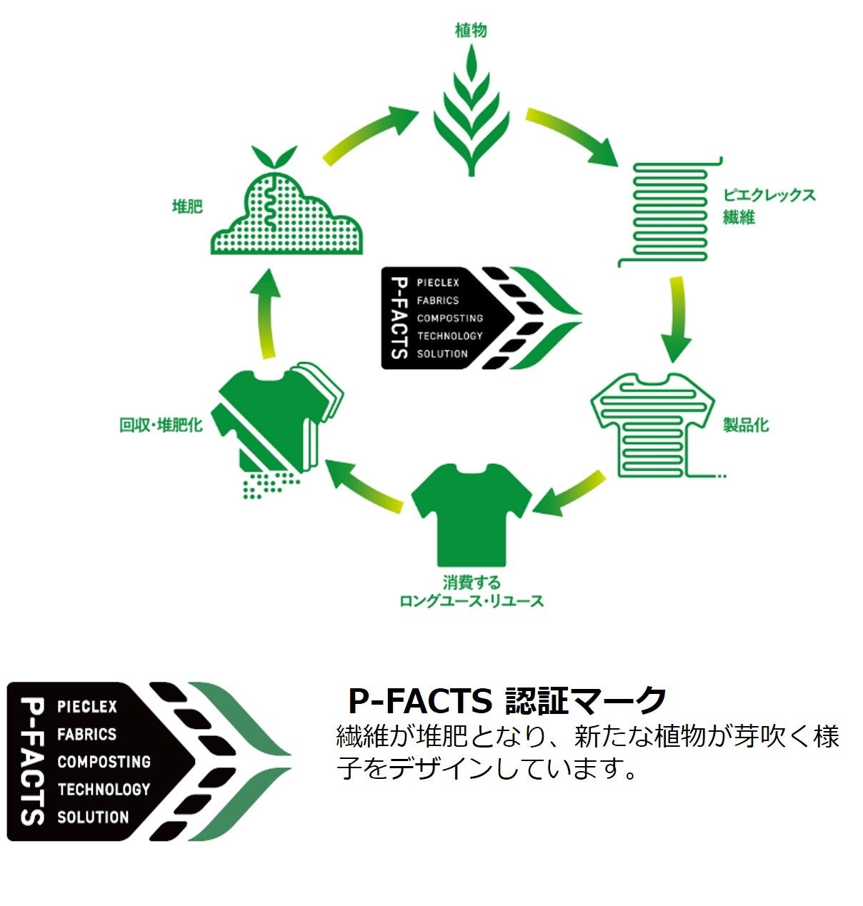 ピエクレックス社が推進するP-FACTS(PIECLEX FAbrics Composting Technology Solution)は、植物由来の繊維製品を使用後に回収し、堆肥化を通じて再び自然に還すサーキュラー・テキスタイル・インフラです。「着るだけ、使うだけ」で誰もが循環に参加できる未来を目指し、すでに複数の自治体・企業・教育機関と連携して社会実装が進んでいます。対応製品には「P-FACTS認証マーク」が付与され、堆肥化によって新たな植物を育む循環の象徴として機能しています。