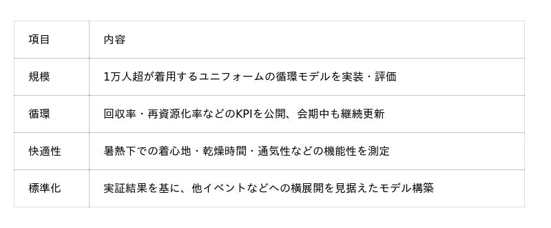 本プロジェクトは、Team P-FACTSによる単なる衣服提供ではありません。ユニフォームそのものを循環インフラとして機能させる実証実験です。以下の到達目標を設定し、会期を通じて運用・評価を行います。