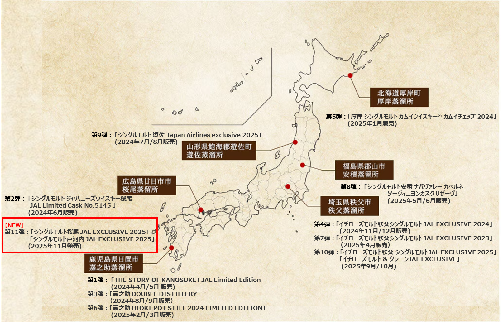 この取り組みの第11弾として、株式会社サクラオブルワリーアンドディスティラリー(所在地:広島県廿日市市、代表取締役社長:白井 浩一郎)の「シングルモルト桜尾 JAL EXCLUSIVE 2025」と「シングルモルト戸河内 JAL EXCLUSIVE 2025」を2025年11月1日から国際線機内販売にて数量限定で販売します。