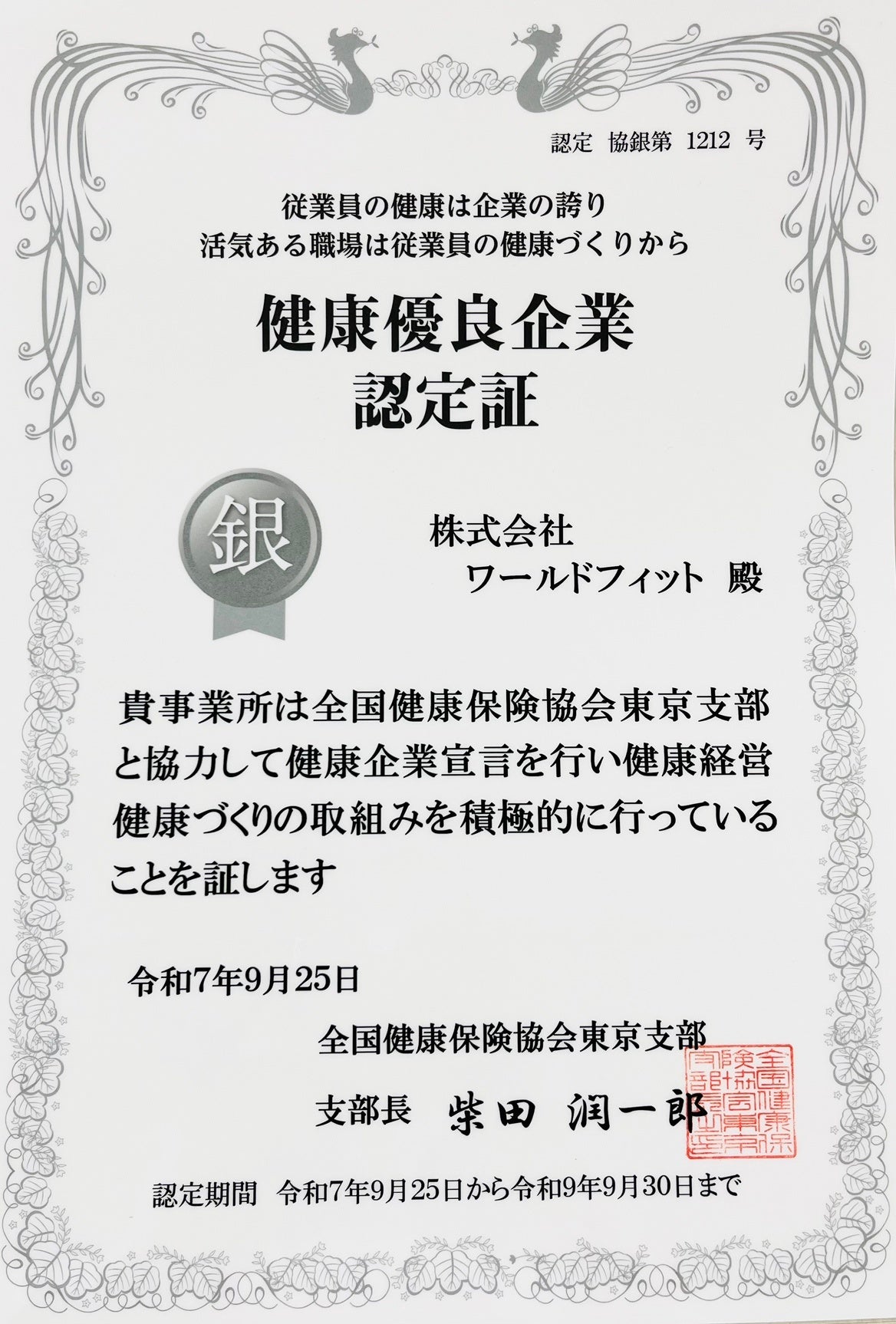 株式会社ワールドフィット(本社:東京都渋谷区富ヶ谷1-37-5 白寿本社ビル4F/代表取締役:高城 大樹、以下「ワールドフィット」)は、健康保険組合連合会東京連合会が実施する「健康優良企業認定制度」において、一定の成果を収めた企業に与えられる「銀の認定」を取得いたしました。