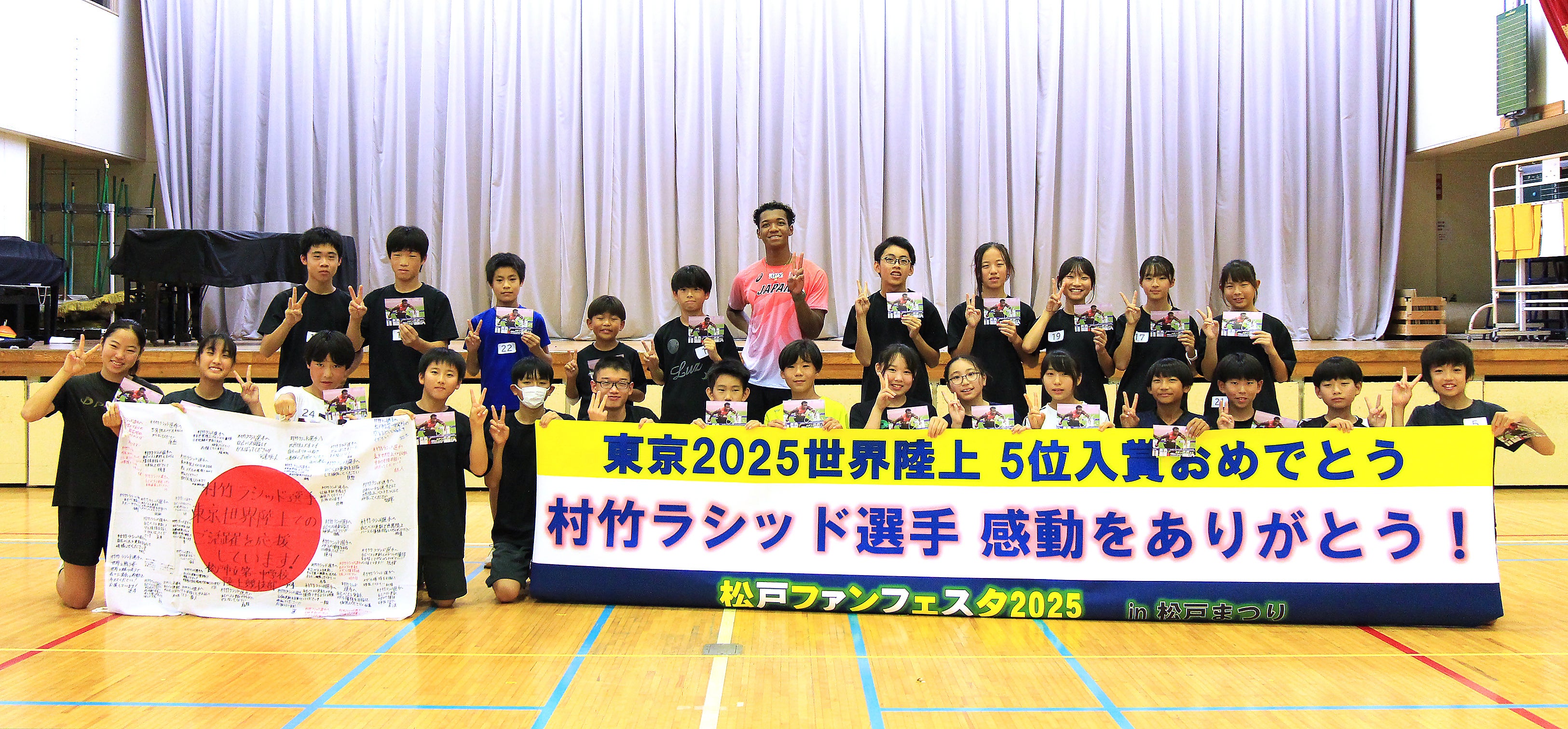 東京2025世界陸上競技選手権大会(以下、世界陸上)終了から2週間。男子110mハードル5位入賞という記録を出した、松戸市出身ハードルスプリンター村竹ラシッド選手(松戸市立相模台小学校・松戸市立第一中学校・千葉県立松戸国際高校・順天堂大学)が、「松戸ファンフェスタ in 松戸まつり」で、松戸市に凱旋しました。当日は、松戸まつりイベント広場でのトークショーと、母校である松戸市立第一中学校での、陸上競技に励む市内の小中学生に向けたハードル走のレクチャーを通じて、市民と交流しました。