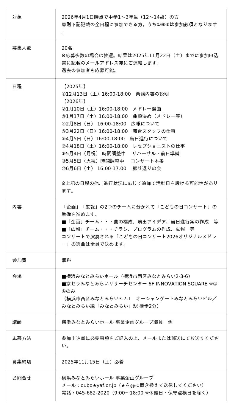 [参加者募集]「こどもの日コンサート2026」関連事業「中学生プロデューサー」(募集締切:2025年11月15日(土) 必着)