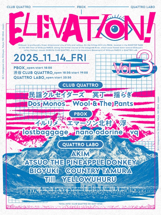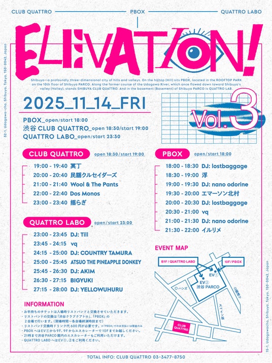 渋谷回遊型音楽イベント「ELEVATION! vol.3」最終ラインナップおよびタイムテーブルが公開!