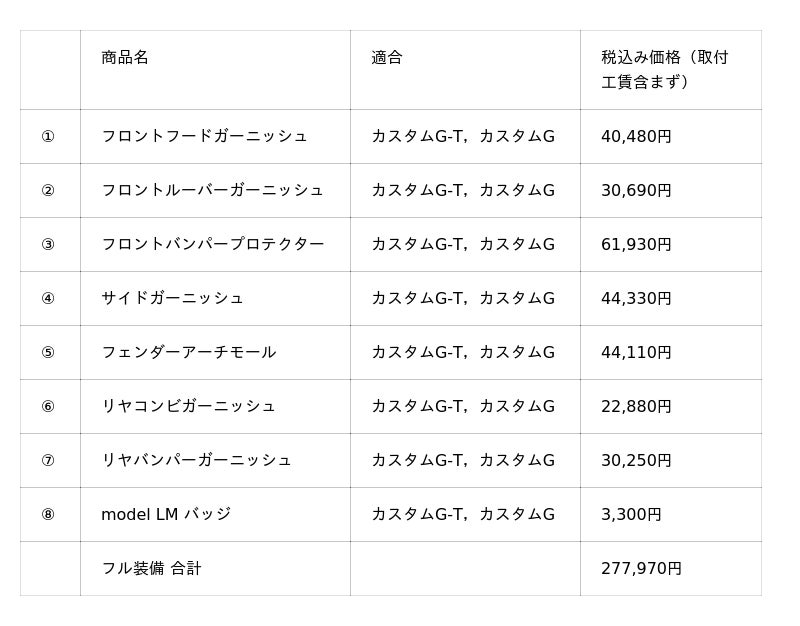 「model LM ルーミー」のカスタマイズパーツ詳細: