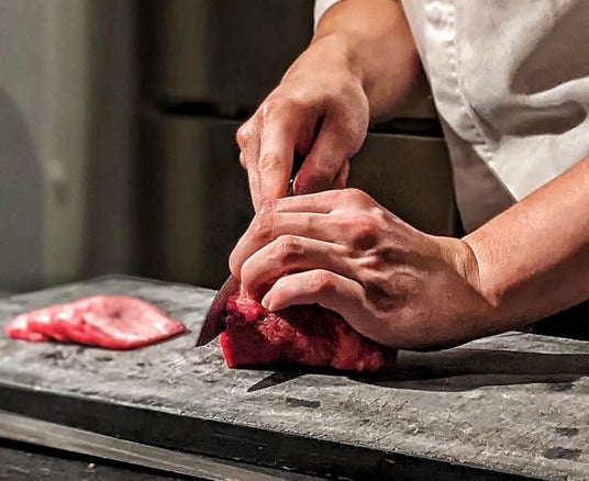 肉の繊維と脂のバランスを見極めながら、最適な厚みと切り方で仕上げていきます。