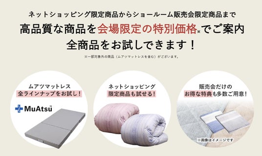今回はあったか羽毛掛けふとんをはじめ、寒さが本格化するこれからの季節にぴったりの厳選寝具を取り揃えました。こだわりの進化が話題のムアツシリーズは全ラインナップを取り揃えており、実際にその快適さをご体感いただけます。