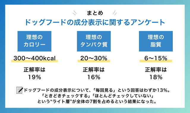 400人を対象にドッグフードの成分表示に関する調査を実施。クイズの正解率はわずか20%以下という結果に。「分からない」という回答が最多だったことから、成分表示はそこまで意識されていないことが分かった。