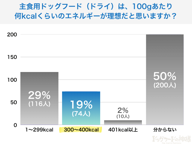 ■ 愛犬の主食用ドッグフード(ドライ)は、100gあたり何kcalくらいのエネルギーが理想だと思いますか?