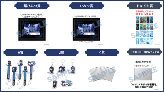 「ひみつ賞」では、ORIHARA監修による額入りライブフォトパネル(サインなし)が用意されています。加えて、同フォトパネルにAdoの直筆サイン(購入者のフルネーム入り)が入った「超ひみつ賞」もラインナップ。A賞はミニキャラクターをデザインしたアクリルフォトプロップス、d賞は同キャラクターのアンブレラマーカー、o賞はライブ写真です。さらに、購入者は、くじを1回引くごとに購入特典として「ドキドキ賞」を1枚必ず受け取ることができます。「ドキドキ賞」では、Adoが作画したキャラクター「はちゃん」の世界観をさまざまな形で楽しめるモバイル壁紙(全20種のうち1枚をランダム)を入手できます。また、ファンサイト有料会員向けの「会員くじ」を購入した方の中から抽選で、Wチャンス賞として最大1024名にAdoの複製サイン入りのアザーカットライブ写真が当たります。