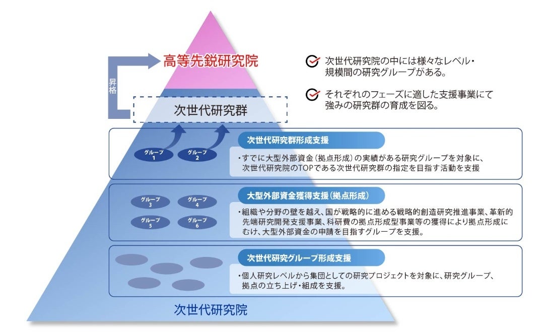 今回のVol.17で取り上げる次世代研究群「難治・希少がんに対する再生・細胞医療・遺伝子治療拠点」の指定は、2023年9月に創設された高等先鋭研究院システム創設のもとで初めての指定となります。本学の研究ポリシーでは、「個人」ではなく「群」を対象に戦略的に研究推進を行うことを明記しており、強みの拠点へ重点的に投資・支援を行うことを重視しています。次世代研究群の指定は、まさにそのポリシーを具現化するものであり、それぞれに強い「個」を結集し、世界トップレベルの研究群として育成することで、将来的に高等先鋭研究院への成長を目指します。これは、単なる研究開発拠点の構築だけでなく、研究大学としての持続的な成長と、研究大学群全体のレベルアップを目指す私たちの決意の表れです。
