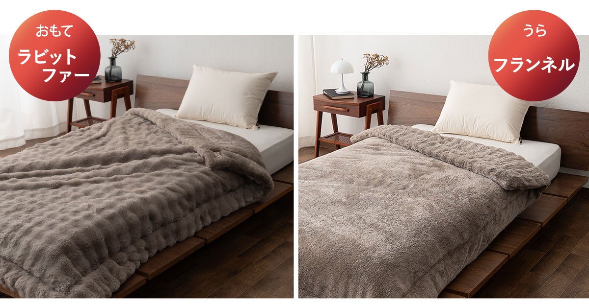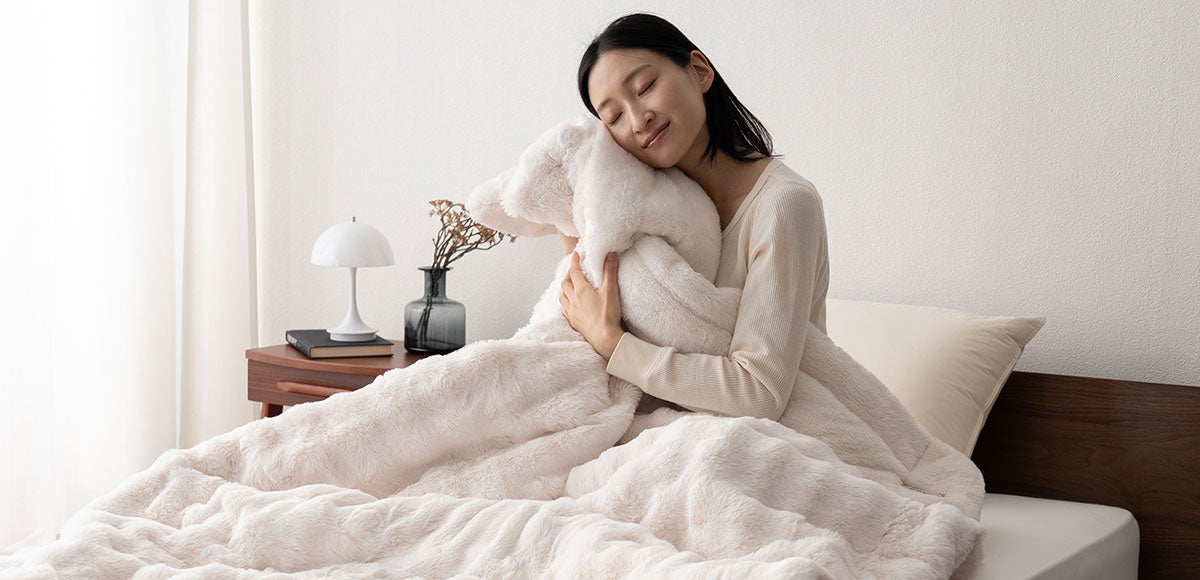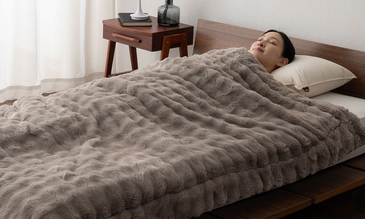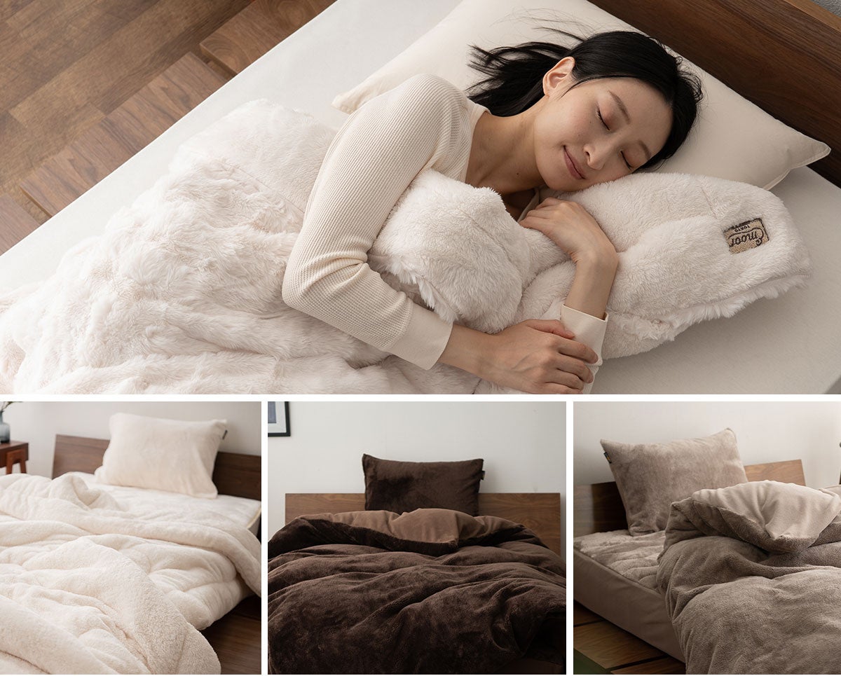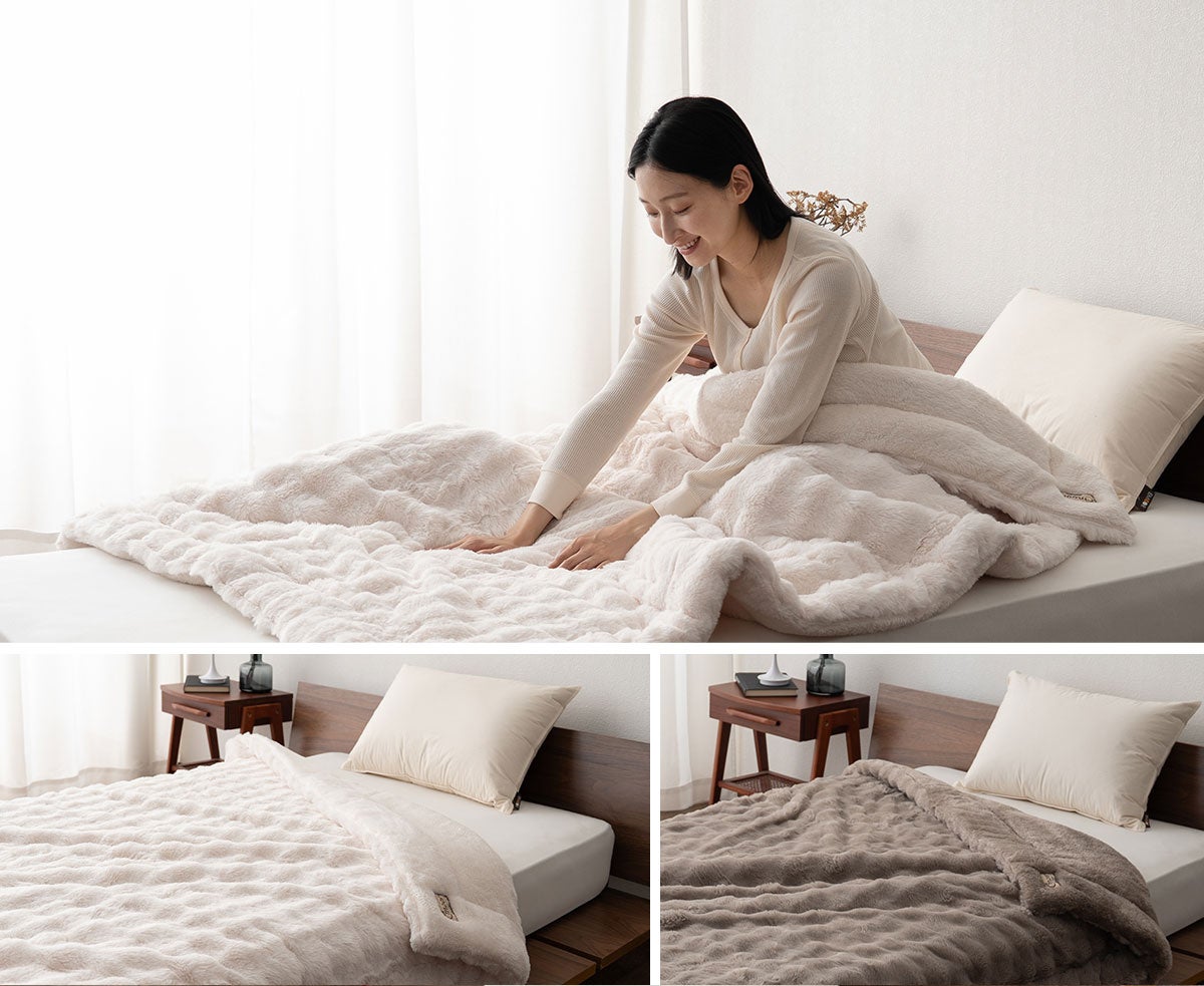 本製品は、人の体から発する蒸気や汗を吸収し、熱に変える特殊素材「エムールヒート+」を採用。発熱エネルギーを持続的に活用することで、心地よい暖かさが長時間続きます。今季新登場の“もこもこ”としたラビットファー生地を組み合わせ、ふんわりとした肌ざわりと見た目の可愛らしさを両立。インテリアにも映える上質なデザインで、寒い季節の寝室を優しく包み込みます。