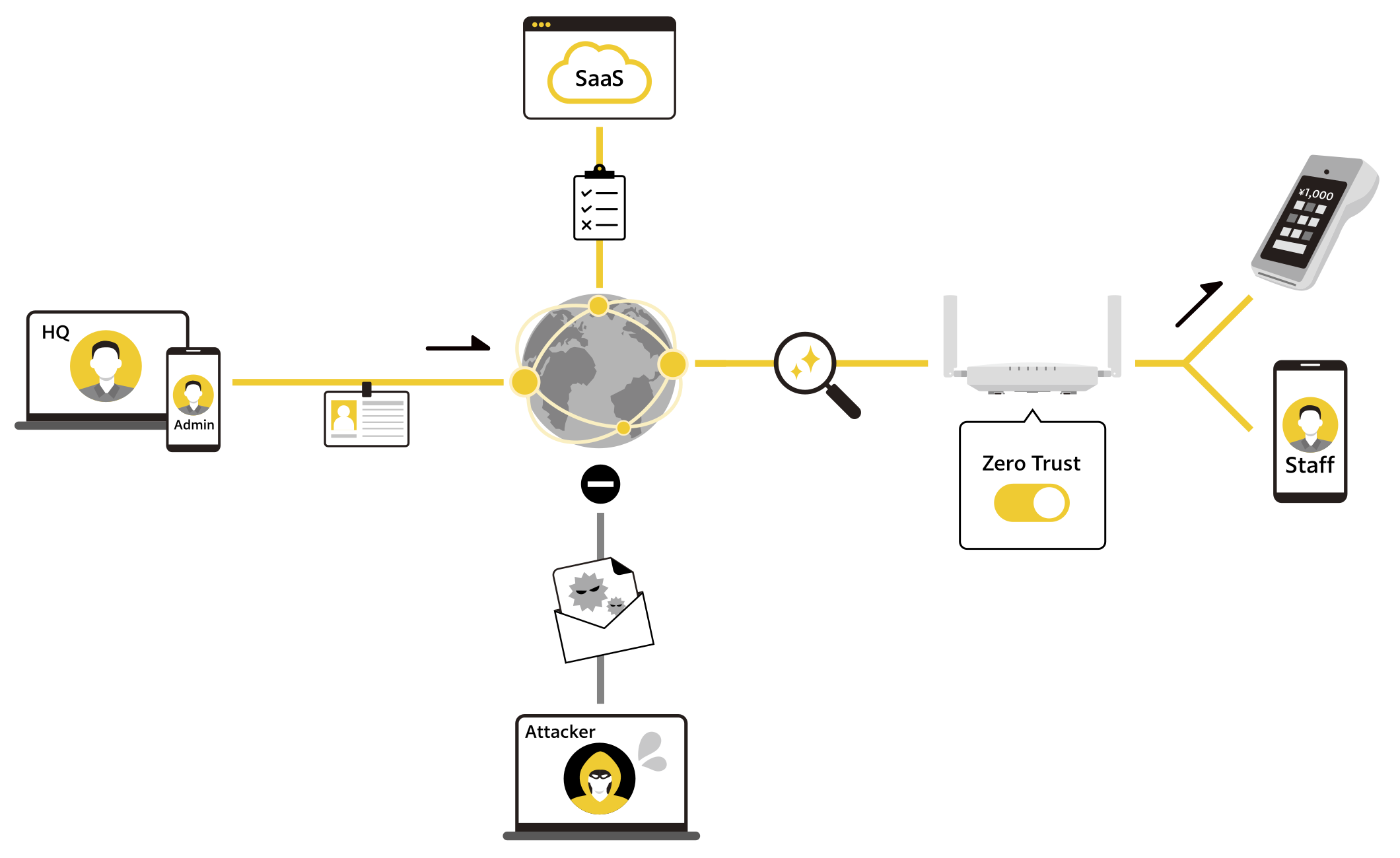 wiffyは、業務用無線LANの提供を通じて培ったネットワーク技術とゼロトラスト制御技術を融合。これにより、従来型のVPNやRDPを不要とし、本店・拠点・在宅を問わず、全ての業務通信を自動的に保護します。