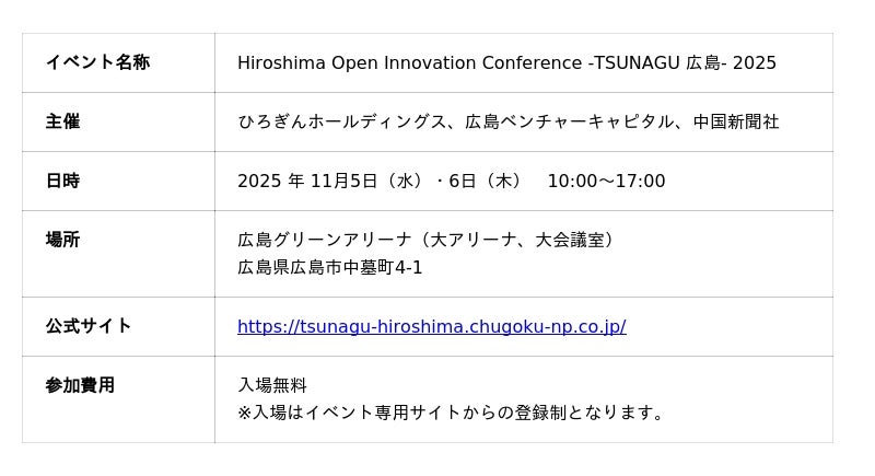 【11月5日~6日】広島県内の企業とスタートアップ企業のマッチングイベント「-TSUNAGU 広島- 2025」に出展いたします