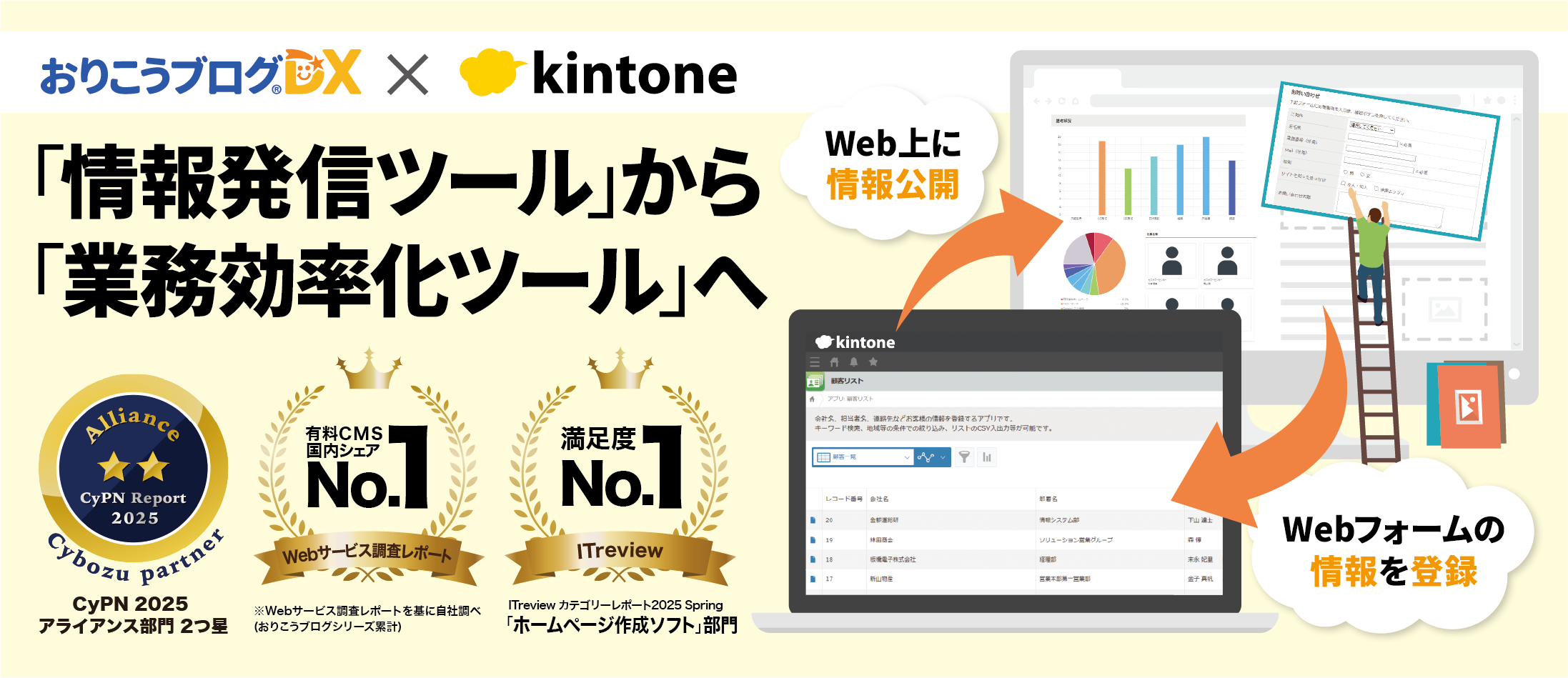おりこうブログDXは、導入実績2万社以上のWebサイト作成ツール(CMS)「おりこうブログ」に、業務改善プラットフォーム「kintone」との連携機能を搭載したWebソリューションです 。Webサイトのフォームから送信された内容をkintoneに自動で登録したり、kintone内のデータをWebサイト上に表示したりできるため、多くの業務で効率化を図れます。複数のkintone連携機能を、ひとつのツール内で使えるのが大きな特長です。