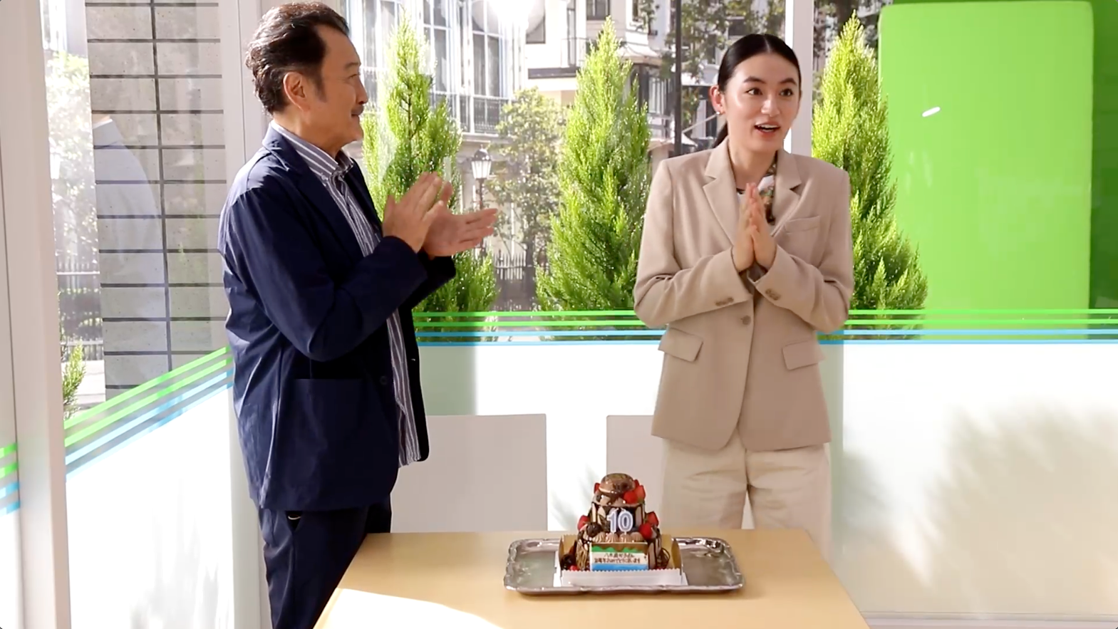 撮影中、今年でデビュー10周年を迎える八木さんをお祝いするサプライズを敢行。インタビューを開始すると見せかけて、八木さんの元に突如「チョコだらけ!」の特製ケーキが登場し、八木さんは「えー!ありがとうございます!」と驚きの表情を見せました。ケーキの最上部には今回のキャンペーン対象商品である「濃厚ショコラドームケーキ」が乗っており、一口食べた八木さんは「めちゃくちゃ濃厚、美味しい!しあわせです」とコメント。吉田さんからも祝福のコメントと拍手が送られ、サプライズは大成功に終わりました。