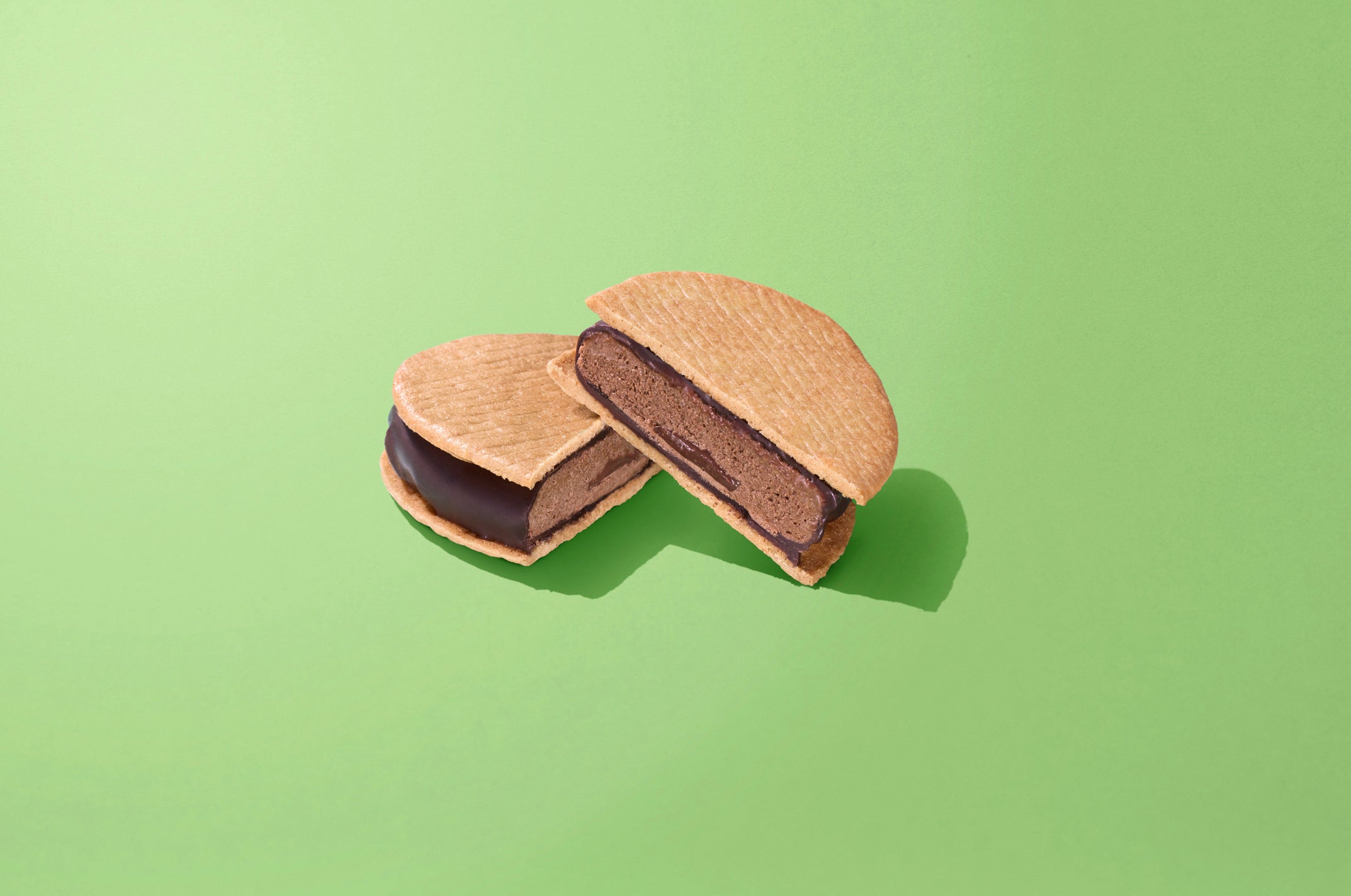 【内 容】中心にほんのりビターな味わいのチョコソースが入ったチョコクリームをパリっと食感のチョココーティングで覆い、サクっと食感のビスケット生地でサンドしました。
