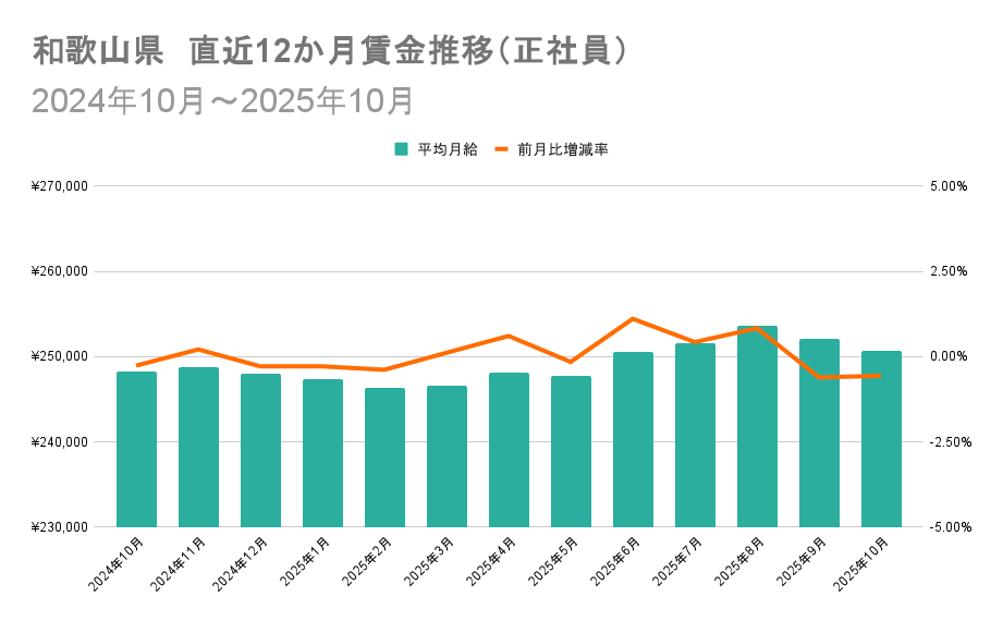 一方、和歌山県の平均月給は-1%から+1%程度の緩やかな変動にとどまっています。