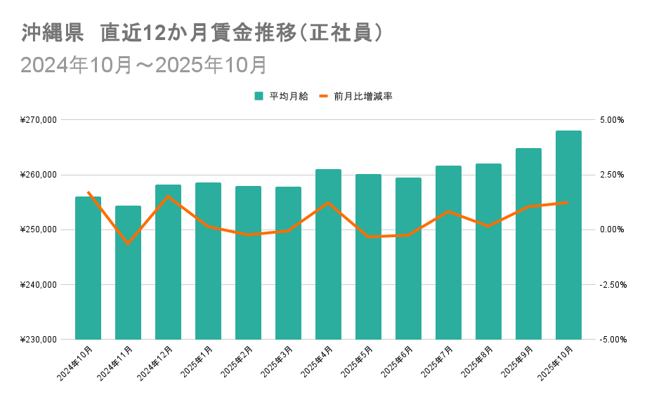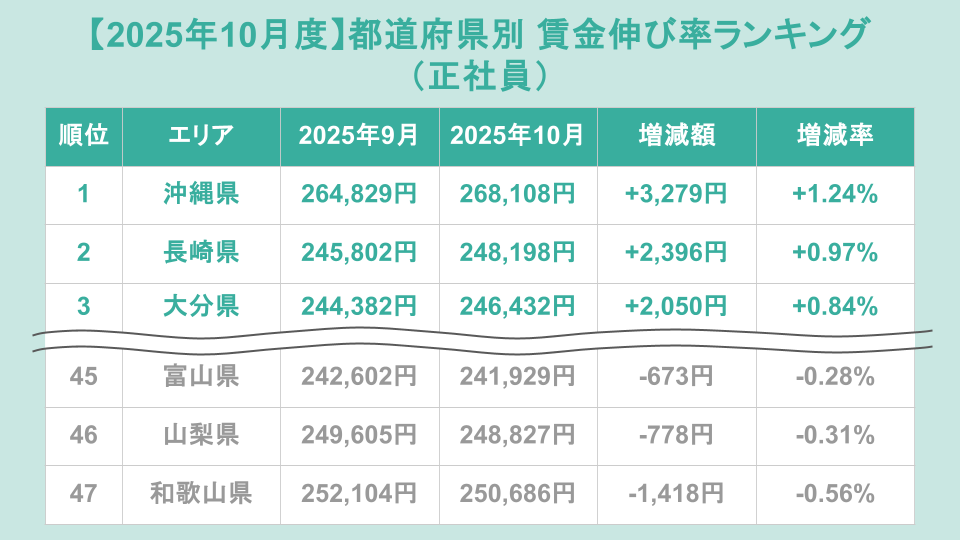 正社員の都道府県別賃金伸び率ランキング(前月比)トップ3は、1位が沖縄県(増加額+3,279円、増加率+1.24%)、2位が長崎県(増加額+2,396円、増加率+0.97%)、3位が大分県(増加額+2,050円、増加率+0.84%)でした。