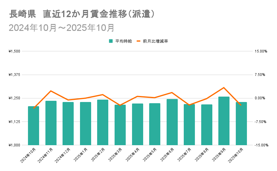 一方、長崎県の平均時給は1,200円前後のレンジで増減を繰り返しながら推移しています。