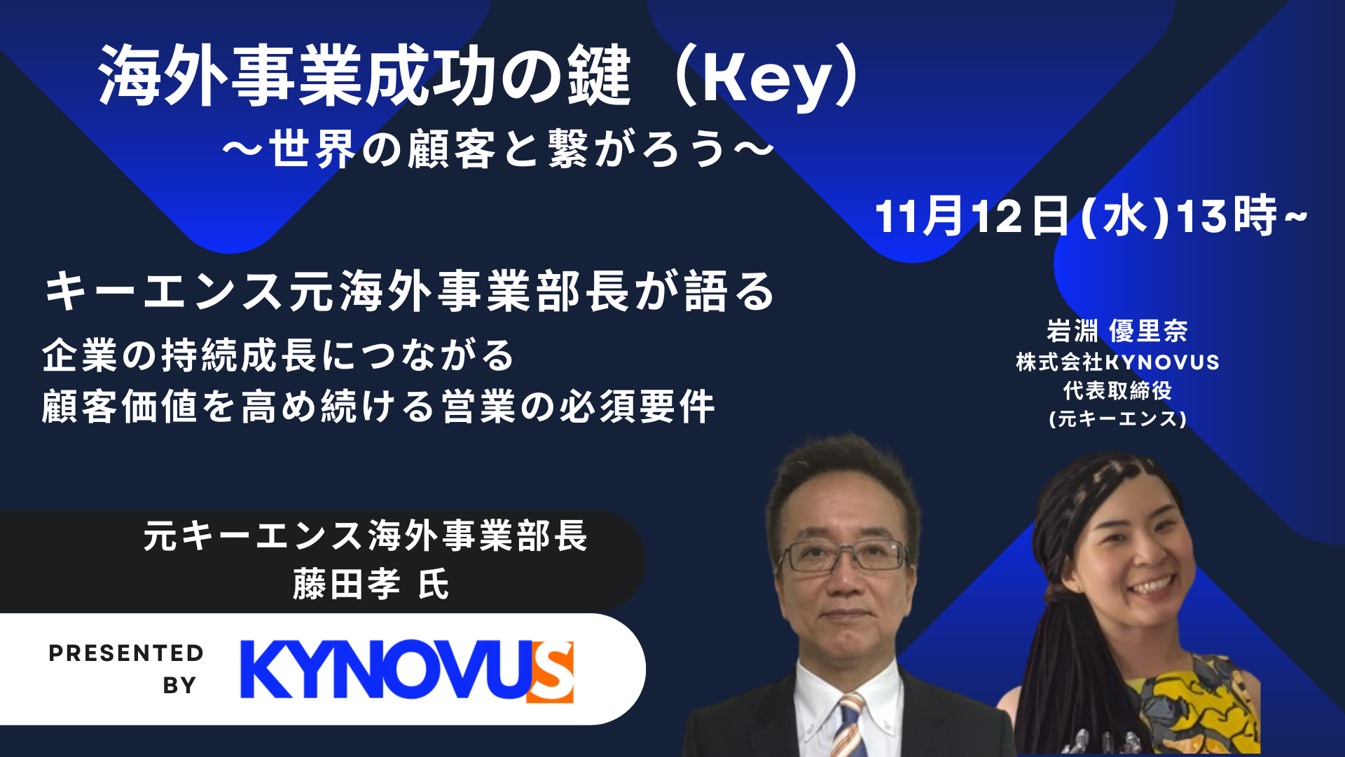 株式会社KYNOVUS(本社:東京都港区、代表取締役:岩淵優里奈)は、無料オンラインセミナー「キーエンス元海外事業部長が語る、企業の持続成長につながる顧客価値を高める続ける営業の必須要件『海外事業成功の鍵(Key)~世界の顧客と繋がろう~』」を2025年11月12日(水)に開催いたします。