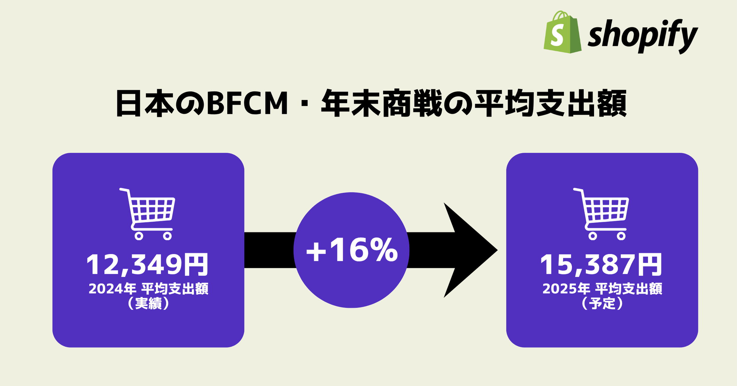 日本国内では、2,000人以上の消費者および500社の中小企業から得た回答に基に、BFCM期間中の平均支出予定額は、前年比16%増の15,387円となりました。インフレや生活費上昇といった経済的な不安が続く中でも、支出額は前年より2,000円以上増加しています。また2024年のBFCM期間中には、Shopifyプラットフォーム上での日本国内の売上が前年比54%増を記録し、平均購入金額は12,349円に達しました。これらの結果は、BFCMが日本の小売カレンダーにおいて年々存在感を強めていることを示しています。