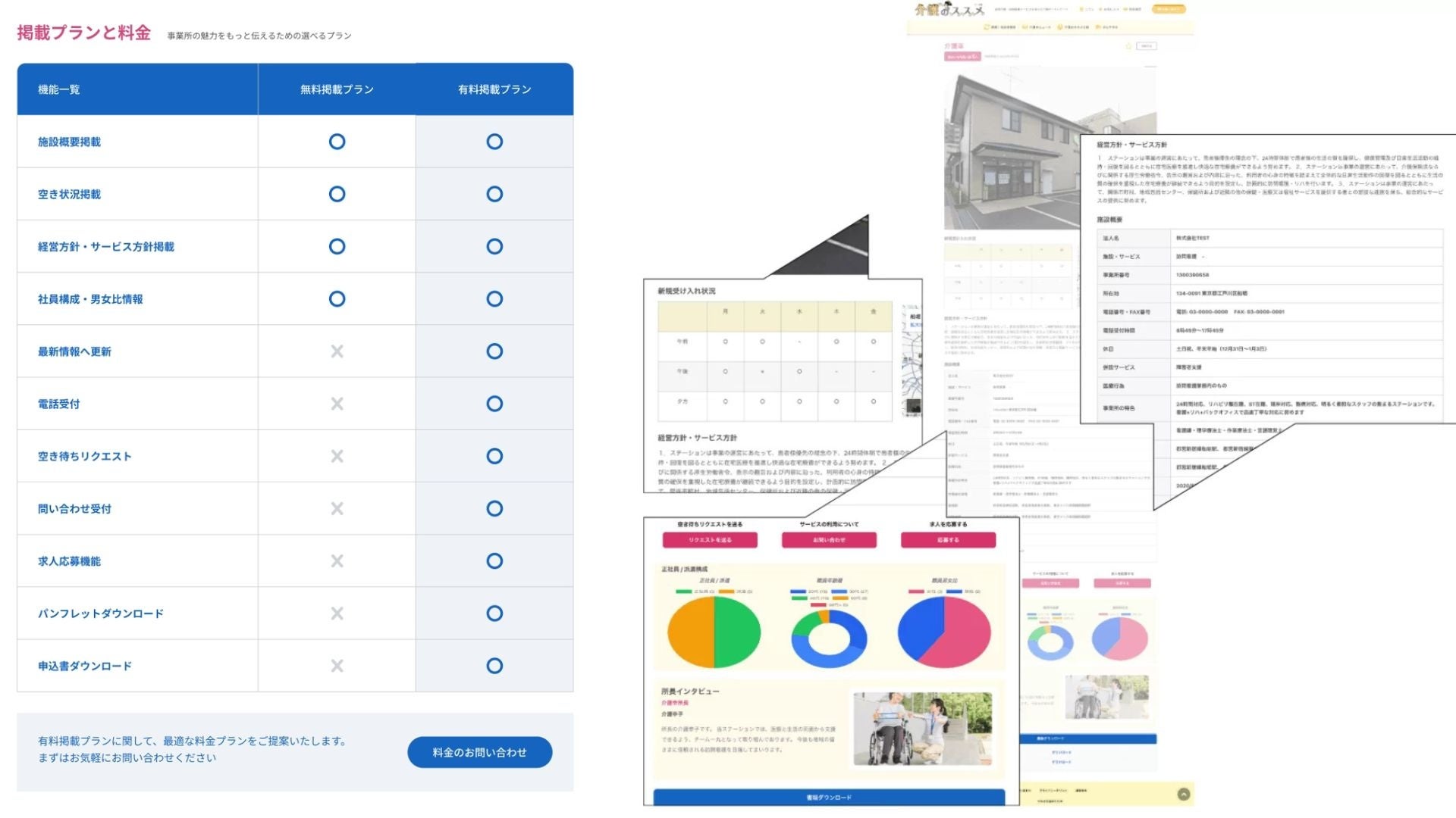 実証期間中は施設・事業所の有料掲載機能(空き状況/受け入れ条件/基本情報/求人/写真・動画 等)を無料で開放。ケアマネジャーが介護事業者を選定する際に必要な情報を集約し、ケアマネジャーと利用者、そして介護事業者のマッチングによる、公共性の効果検証を行います。
