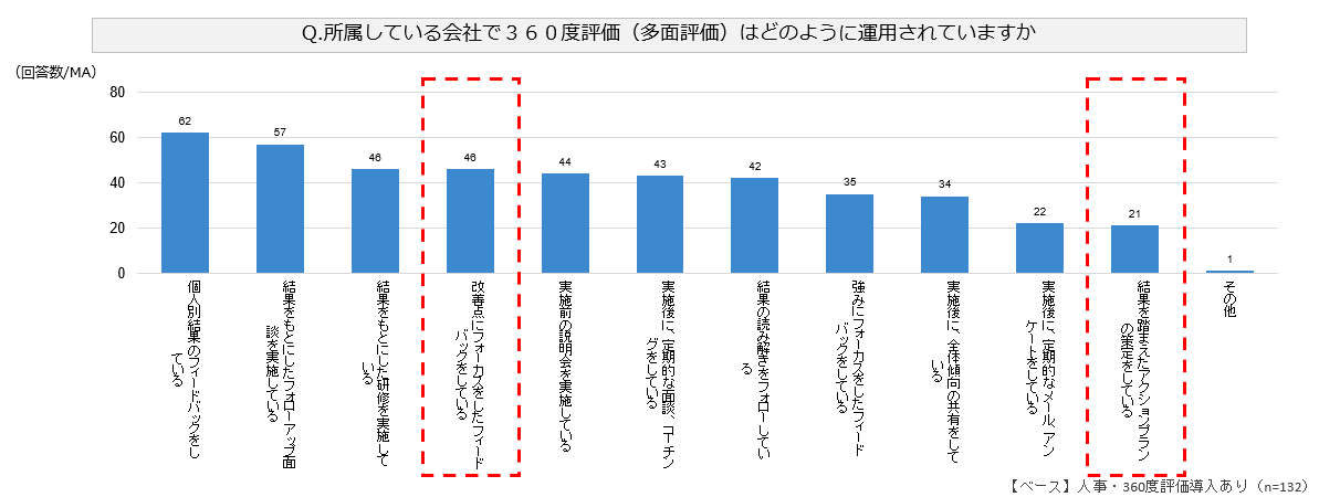 「個人別結果フィードバック」「フォロー面談」「結果をもとにした研修」「改善点フィードバック」など結果の伝達、結果の理解・受容促進施策が上位に挙がっています。TOP3に加えて「改善点フィードバック」も上位となり、気づきの促進を意図する様子が見えるも、いずれも全体の半数未満に留まっています。「アクションプラン策定」の割合は特に低く、人材開発としての活用は発展途上と考えられます。