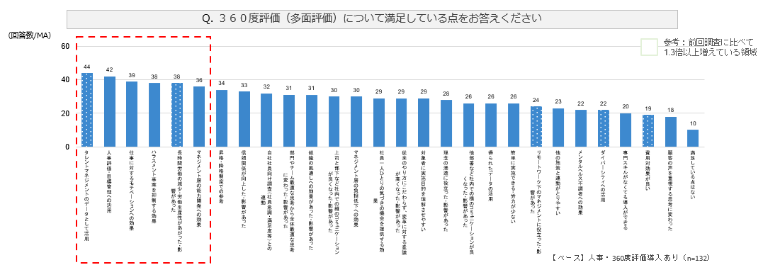 昨年度は下位だった「タレントマネジメント活用」がトップに浮上し、人的資本経営を含めたデータ活用の推進がうかがえる結果となりました。「長時間労働の減少」や「リモートワーク下のマネジメントに役立った」「ダイバーシティの活用」等、今日的テーマへの満足も拡大している傾向がわかります。ほか、「人事評価・目標管理活用」「仕事に対するモチベーションへの効果」「ハラスメント事案の抑制」などが上位に挙がっています。