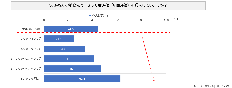 【導入率 (人事)】人事向け調査によると、全体の4割強が360度フィードバック(多面評価)を導入しており、大手企業ほど導入率が高まる傾向にあります。