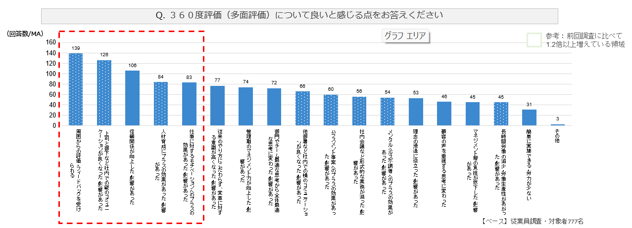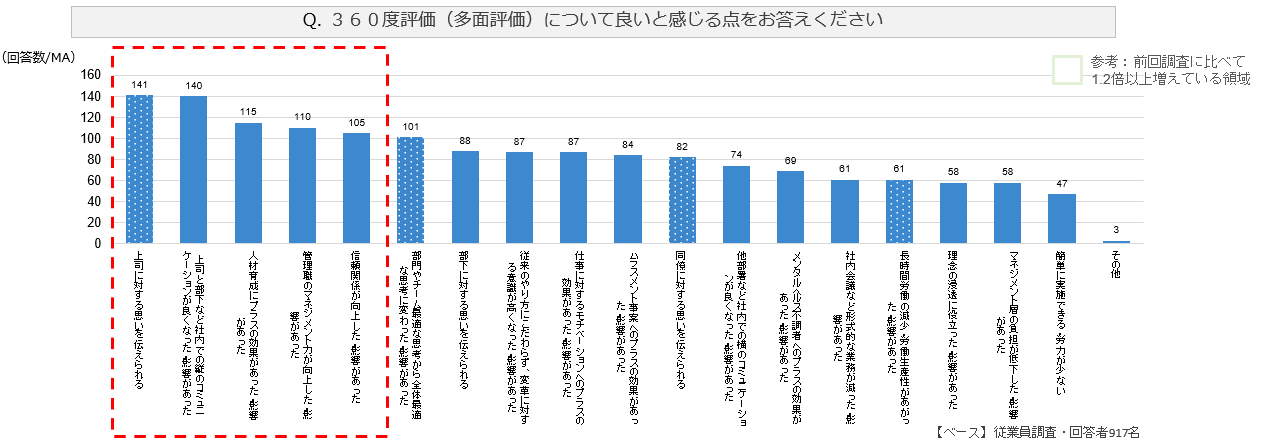 回答者は「上司に思いを伝える」「縦のコミュニケーション向上」機会として、対象者は「周囲の評価を知る」「縦のコミュニケーション向上」機会としてのメリットを多く感じています。