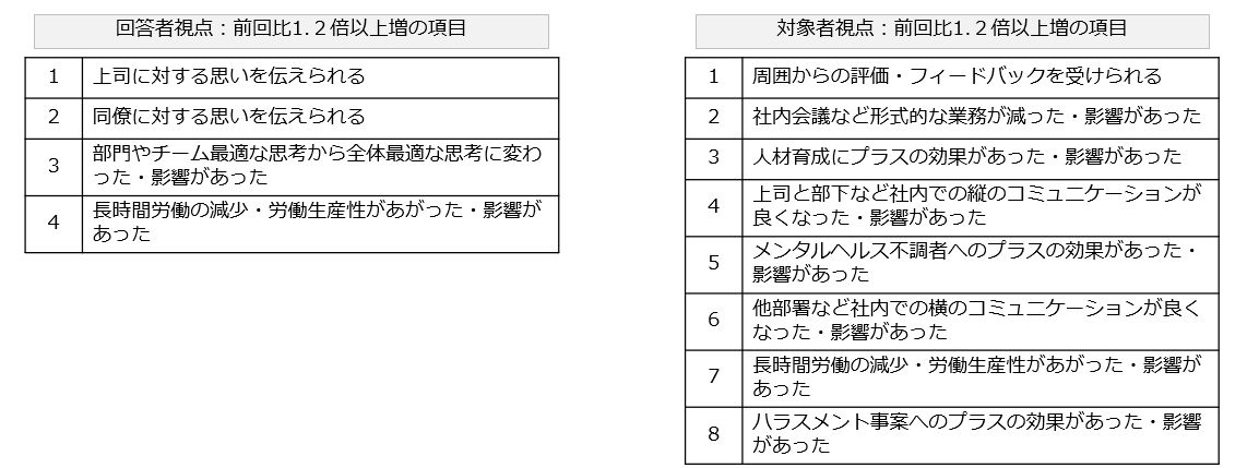 回答者では、「上司/同僚に思いを伝えられる」意思疎通に加え、職場の思考・行動変化に関する項目が伸びました。対象者では、フィードバックそのものに加え、周囲との関係性、行動様式や育成面の効果実感が高まっていると言えます。360度フィードバックを通じて、職場での相互の意思疎通や信頼を高める動きが広がっており、回答者・対象者層が感じている組織全体の一体感やマネジメント負荷といった課題に対し、関係性の改善と行動変化の積み重ねがボトムアップ的な支えとなりつつある様子がうかがえる変化となりました。