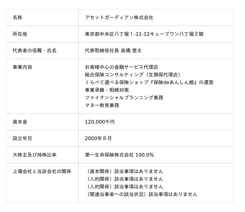 アセットガーディアンは、保険ショップ事業、法人事業その他訪問型保険代理店事業を営んでおり、保険ショップ事業においては、首都圏で『保険deあんしん館』を運営しております。この度、同社が、組織再編を計画していることを受け、当社が保険ショップ事業を譲り受けることとなりました。