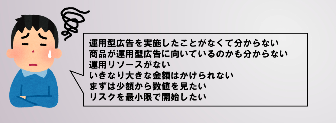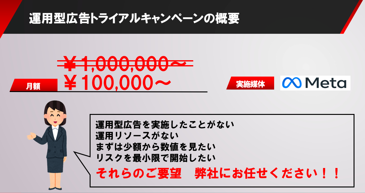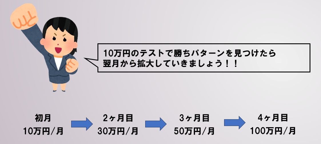※通常は月額100万円(税別)~での本格運用を承っておりますが、トライアルではまず10万円分の配信で数値の出方を確認します。