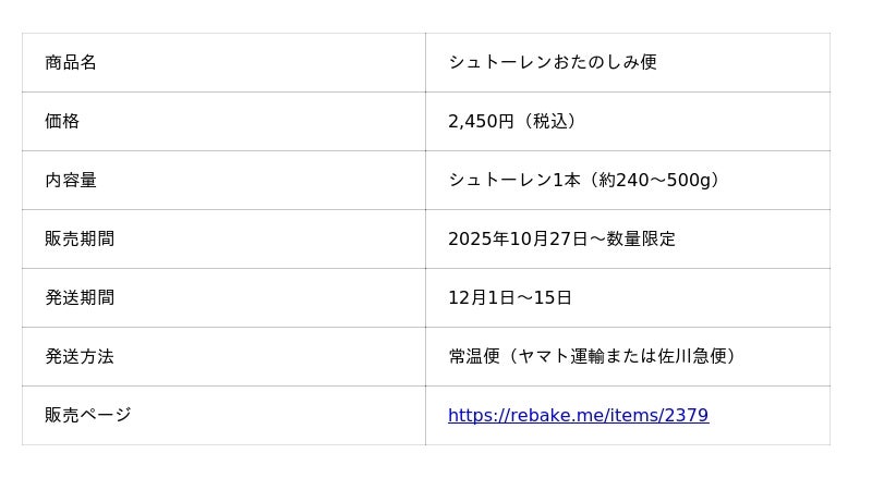 パンの通信販売、廃棄ロス削減サービスのrebakeを運営する合同会社クアッガ(本社:東京都墨田区、代表:斉藤優也)は、全国の人気ベーカリー4店のシュトーレンからどれか1本が届く「シュトーレンおたのしみ便」を販売開始しました。2022年の開始以来、毎年完売となる人気企画で、今年は数量を増やして再登場。福岡・宮城・富山・静岡の4店舗が参加し、どのお店のシュトーレンが届くかはお楽しみです。価格は2,450円(税込)で、eギフトにも対応。クリスマスギフトにもぴったりな、冬限定の特製セットです。