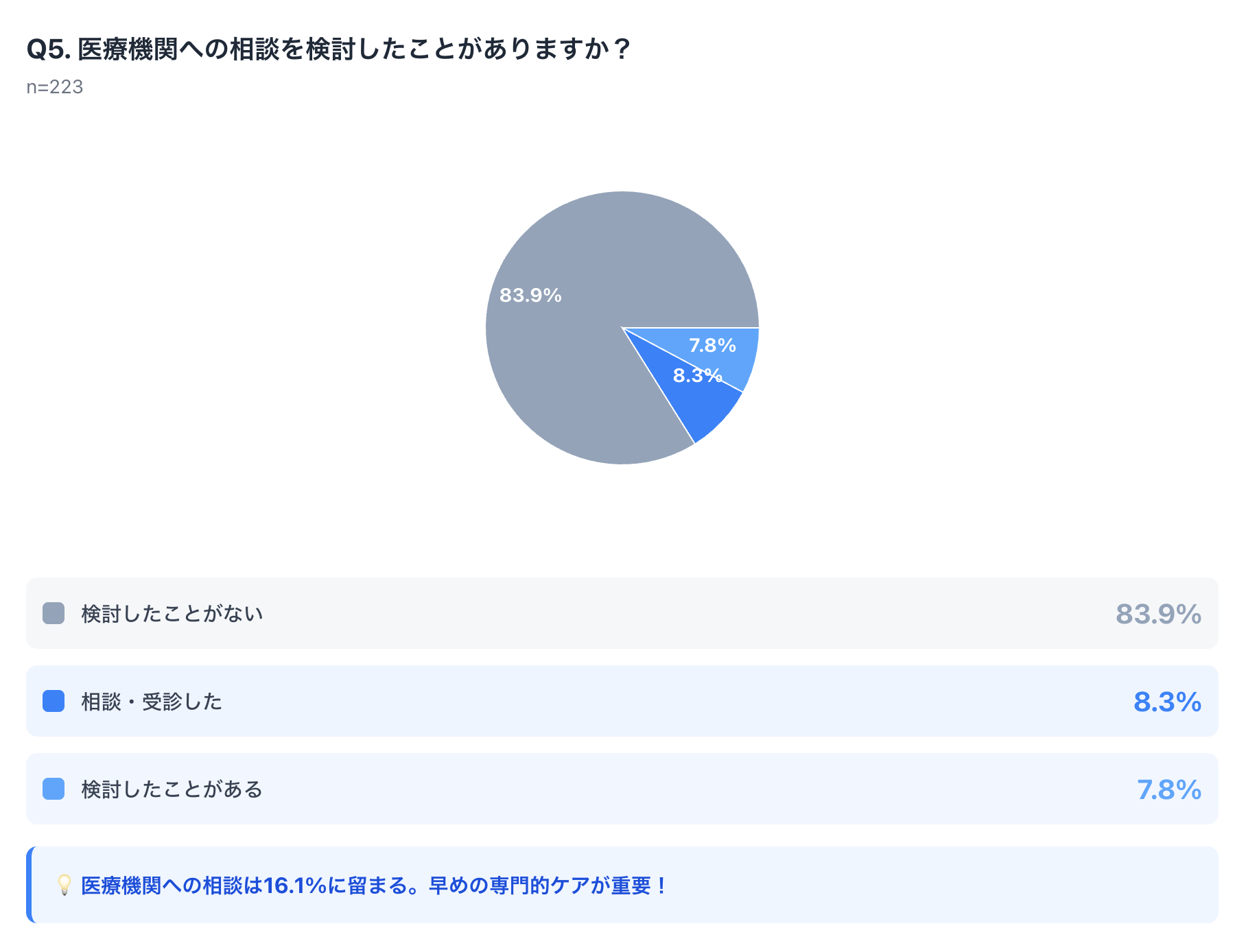 その結果、**「相談・受診したことがある」が8.3%、「検討したことがある」が7.8%**で、合わせて約16%にとどまりました。