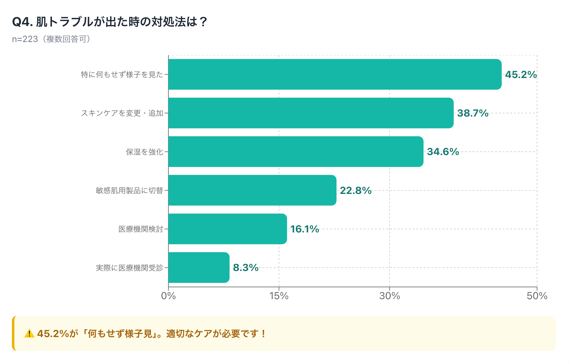 その結果、**「特に何もせず様子を見た」が45.2%**で最も多く、次いで「スキンケアを変更・追加した」(38.7%)、「医療機関での相談を検討した」(16.1%)という結果になりました。