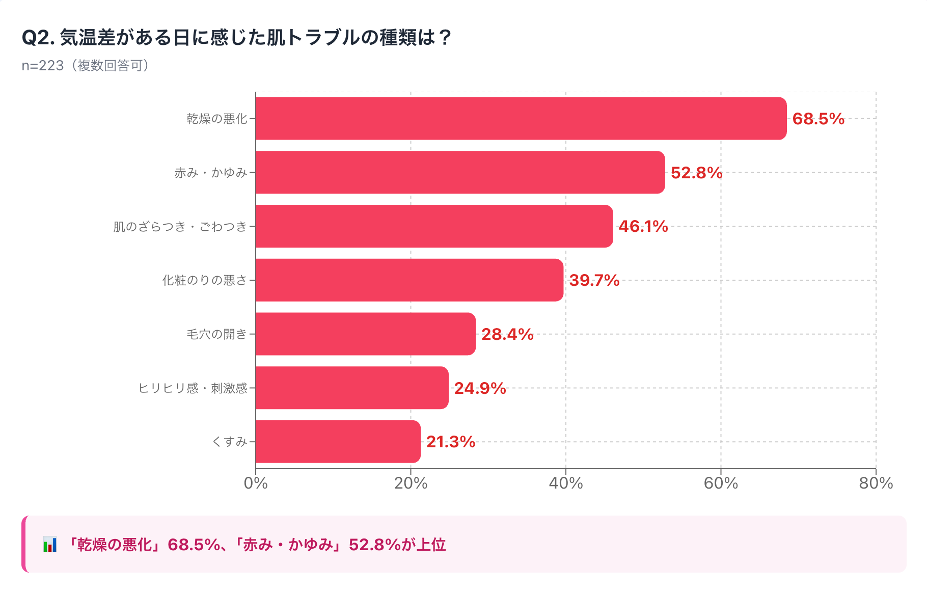 その結果、約7割の方が前日比5℃以上の気温差で肌トラブルを経験しており、特に「乾燥の悪化」「赤み・かゆみ」「ざらつき」が多いことが分かりました。