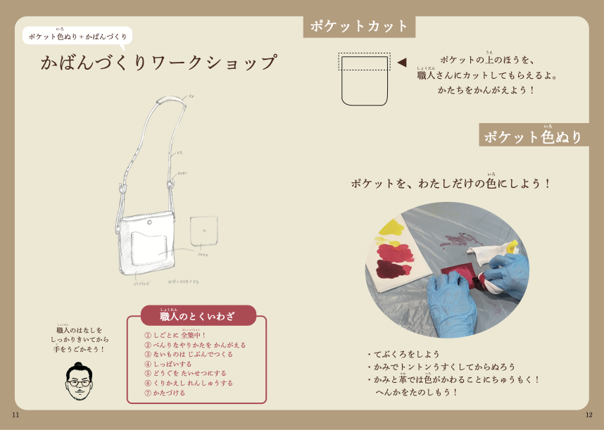 まず、ランドセルが完成するまでの工程を見学し、革のチェック・裁断・組み立て・ミシン作業・検品など、ものづくりの現場を体感。続く「鞄づくりワークショップ」では、本物の素材と道具を用い、ポケットの形や染色を自由にデザインし、世界に一つだけのオリジナル鞄を完成させます。