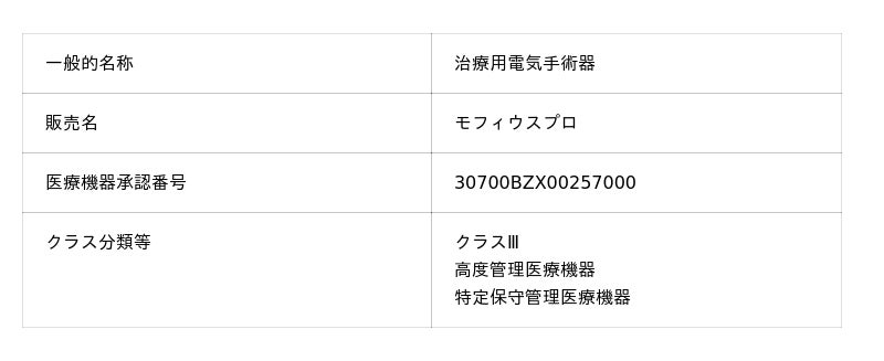 軟組織の蒸散に使用する「モフィウスプロ」の医療機器製造販売承認(承認番号:30700BZX00257000)を2025年10月3日付で取得しましたのでご案内申し上げます。