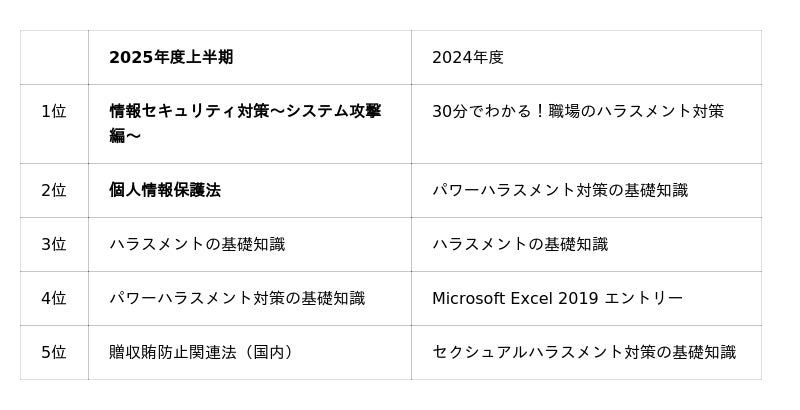 2025年度上半期の総合ランキングは、昨年度トップ3をハラスメント対策教材が独占した状況から様変わりし、「情報セキュリティ対策」「個人情報保護法」が1位・2位を占める結果となりました。この背景には、企業が全社的に取り組むべき最重要課題として「情報セキュリティ教育」を位置づけ、多くの企業で活用された結果と考えられます。