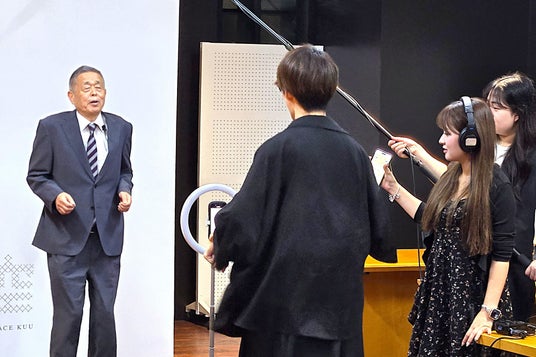 映像を撮影する学生と大正大学の柏木正博理事長(写真左)