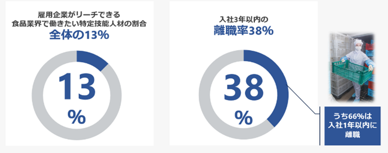 食品業界の人手不足は深刻な課題であり、2028年度末までに飲食料品製造業で13万9,000人、外食業で5万3,000人の特定技能外国人材※2が必要とされています。しかし既存の採用構造では、地方中小企業は採用手段が乏しかったり、採用段階での雇用企業と求職者の認識不一致による早期離職やトラブルが多発したりと、依然として人材確保難が続いているのが現状です。雇用企業1社あたりがリーチできる「食品業界で働きたい特定技能外国人材」の割合は全体の13%に留まり、入社3年以内の離職率は38%にも上ります。(内、66%は入社1年以内の離職)