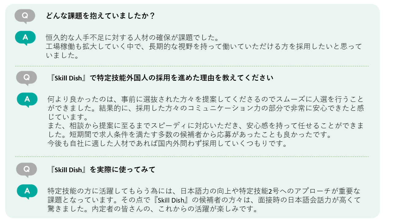 これら課題に対し、『SkillDish』は求人から就労までの採用プロセスをDX化することで、採用手段が乏しかった地方中小企業も自社に適し人材を採用できるようにします。さらに食品業界特有の雇用条件を求職者に的確に伝える機能設計と入国前教育により、採用後のミスマッチを防止して長期雇用を実現することで課題を解決していきます。