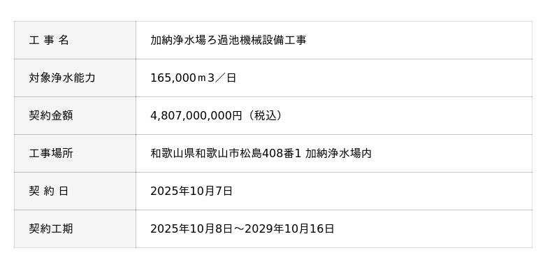 水ing株式会社のグループ会社である水ingエンジニアリング株式会社(社長︓須山晃延、本社︓東京都港区)は2025年10月7日、和歌山市企業局との間で「加納浄水場ろ過池機械設備工事」に関する契約を締結しました。