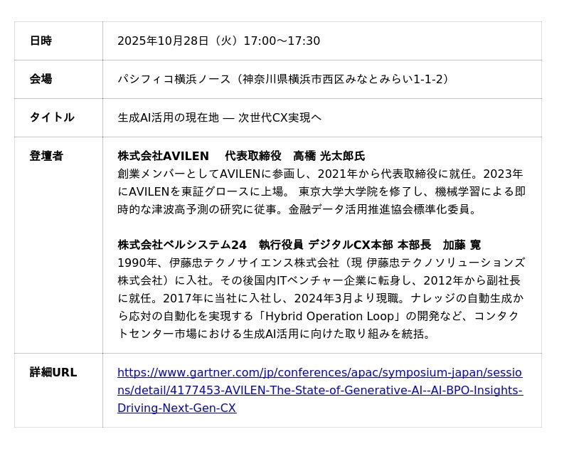 株式会社ベルシステム24(本社:東京都港区、代表取締役 社長執行役員:梶原 浩、以下:当社)は、当社の執行役員 デジタルCX本部 本部長・加藤 寛が、2025年10月28日(火)から開催される「Gartner(R) IT SYMPOSIUM/Xpo(TM)」に登壇することをお知らせします。