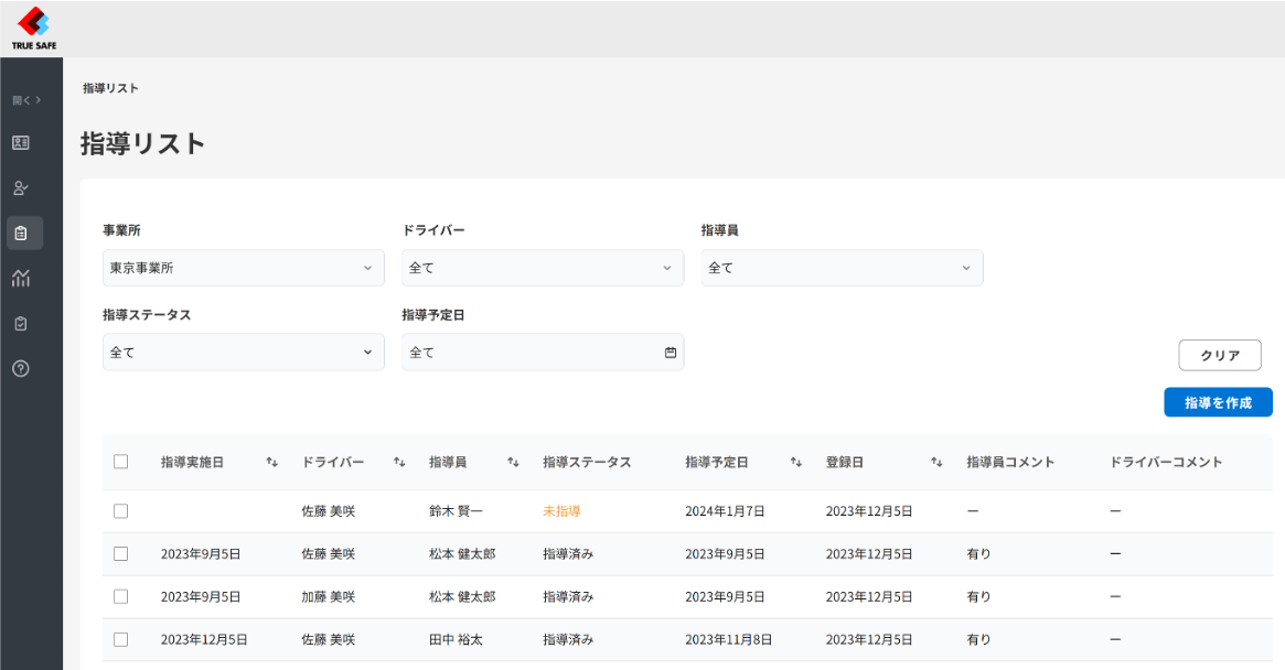 - 運転シーンごとの分析結果をスコアで評価し、指導対象となるドライバーを選定することが容易になり、指導履歴も管理